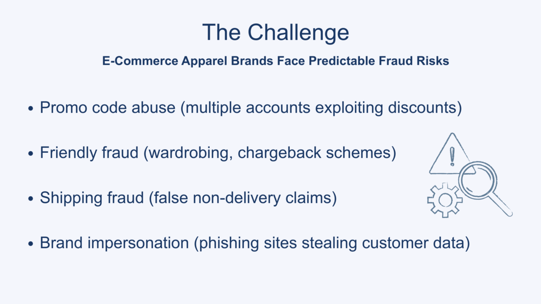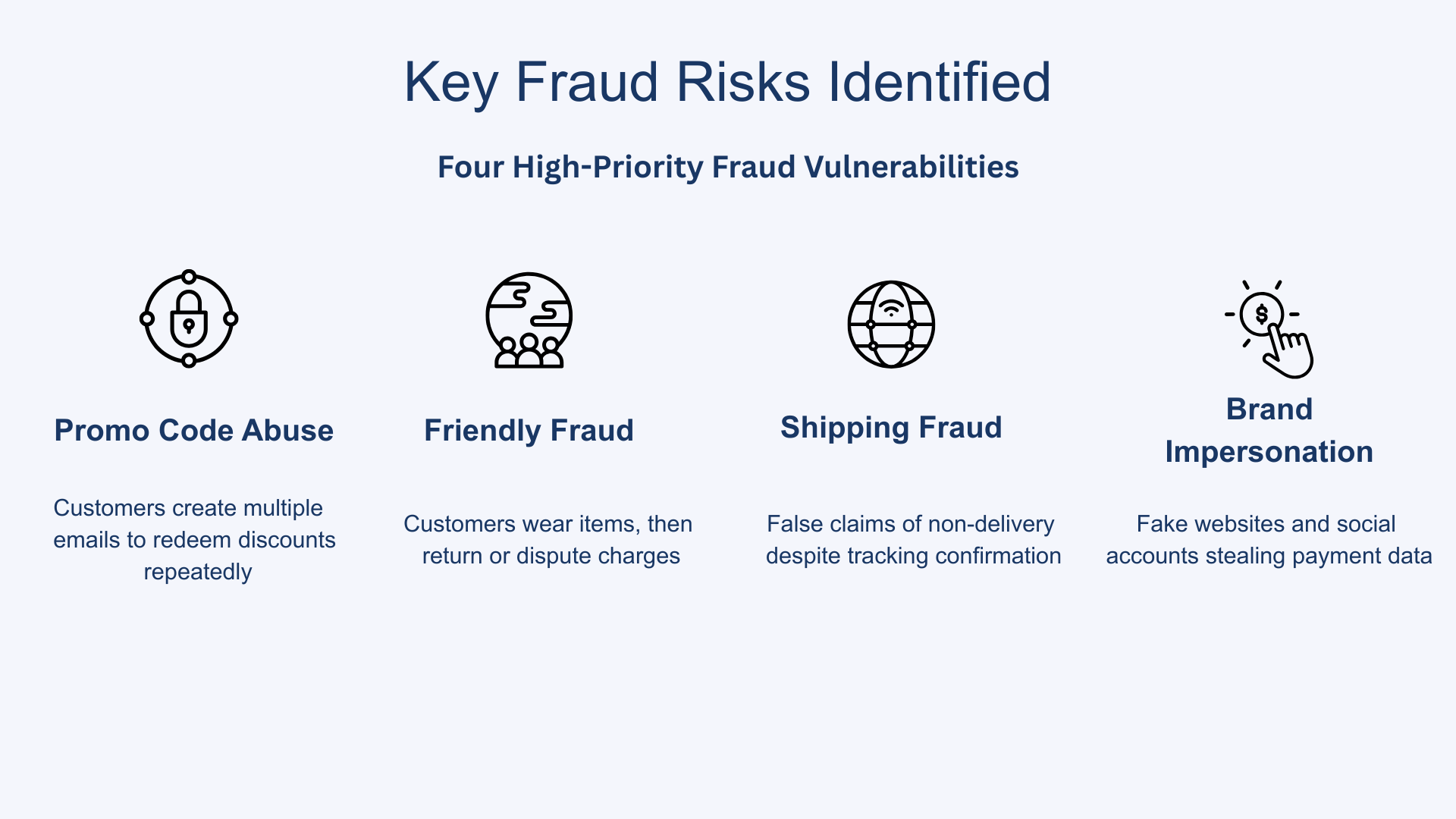 A comprehensive fraud risk assessment for an online apparel brand. The assessment identified vulnerabilities in promo code redemption, return policies, shipping processes, and brand protection, and delivered actionable controls to prevent revenue loss and maintain customer trust.