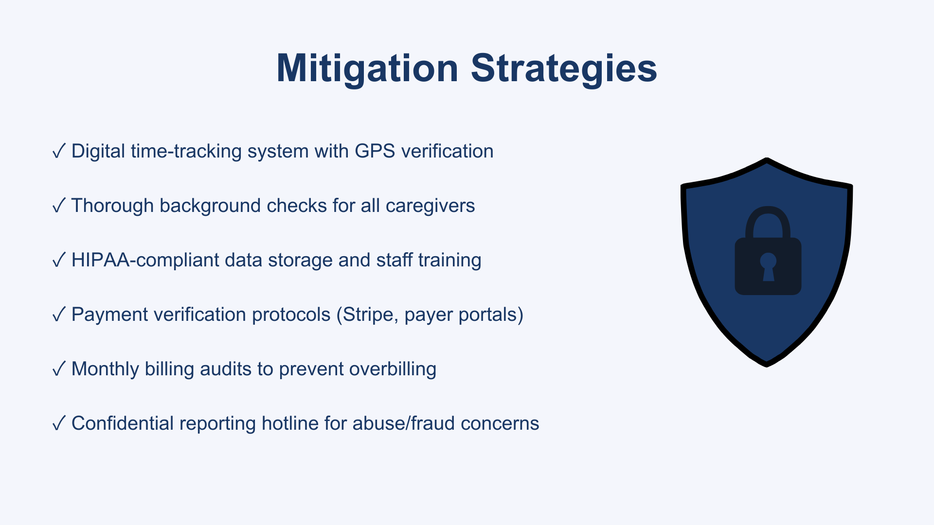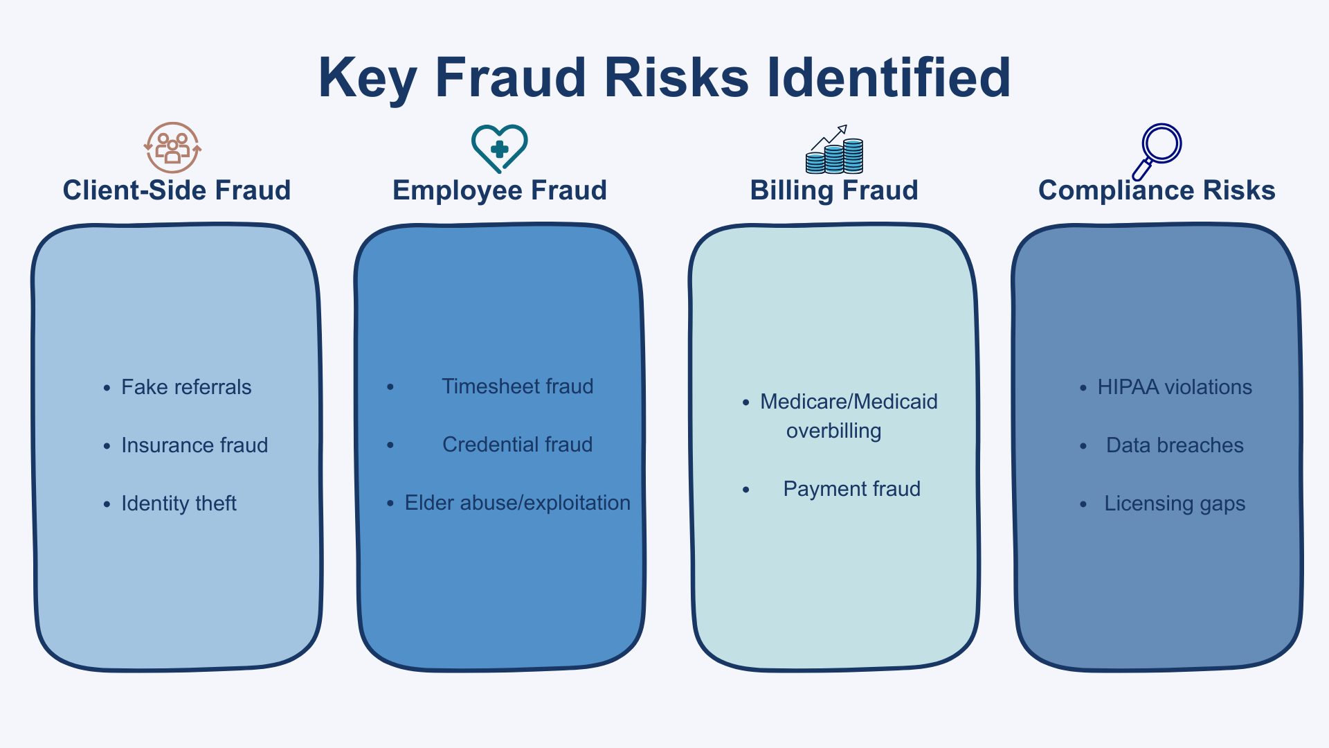 A comprehensive fraud risk assessment for an in-home care agency preparing to launch operations. The assessment identified vulnerabilities in billing processes, caregiver verification, and client intake procedures, and delivered actionable controls to mitigate risk before the agency's official opening.