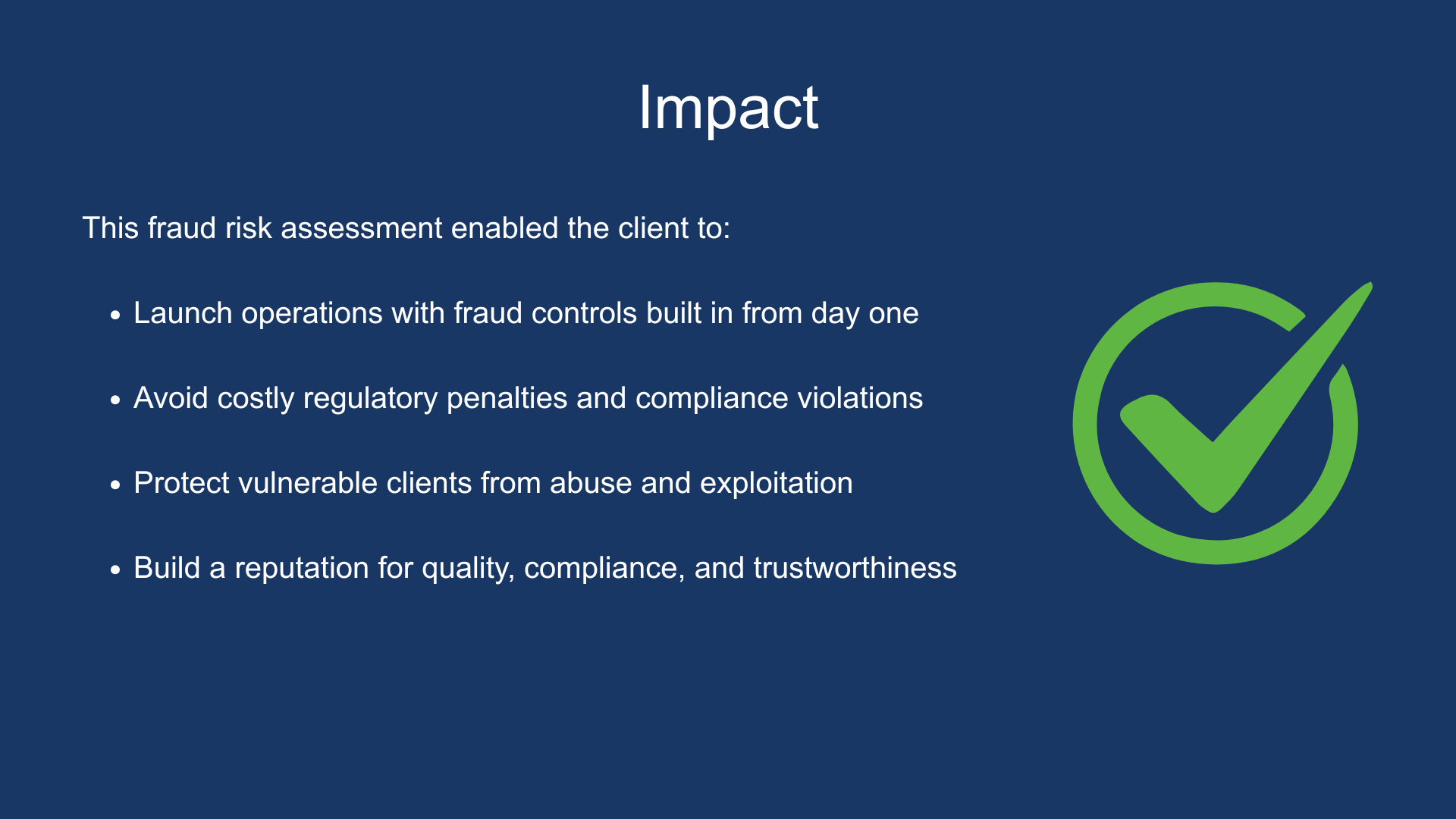 This fraud risk assessment enabled the client to launch operations with fraud controls built in from day one, avoid costly regulatory penalties, and protect vulnerable clients from potential abuse and exploitation.